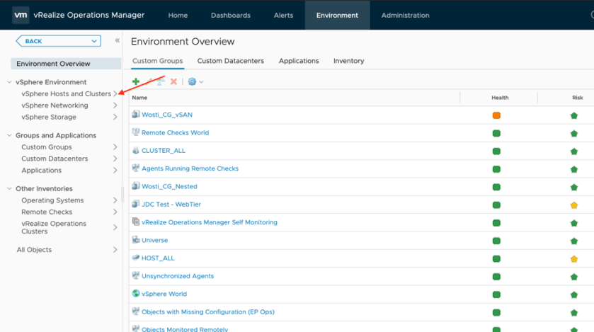 In the Environment Overview, select the group you would like to browse – for example “vSphere Hosts and Clusters.”