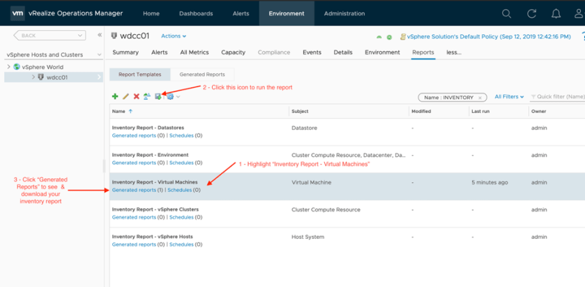 Using the navigation pane, select the vSphere cluster / folder / resource pool containing the virtual machines you would like to run an inventory report on, then select “more…” to view the Reports tab.
