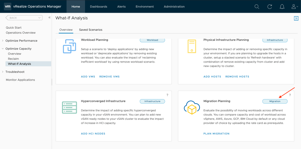 You should see options for “Workload Planning,” “Physical Infrastructure Planning,” “Hyperconverged Infrastructure,” and “Migration Planning.”