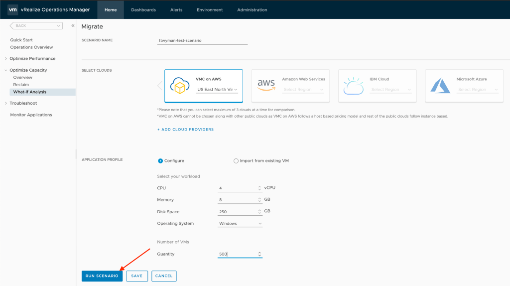 You should now see options for different cloud providers – simply click on one, fill out the form to characterize the workloads you are moving (or import a selection of virtual machines from your inventory), and click “Run Scenario.”