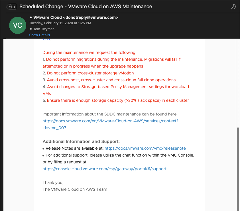 In this post, I would like to highlight how we notify you of upgrades / maintenance, and how to stay up to speed with ongoing feature releases in VMware Cloud on AWS.