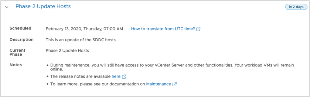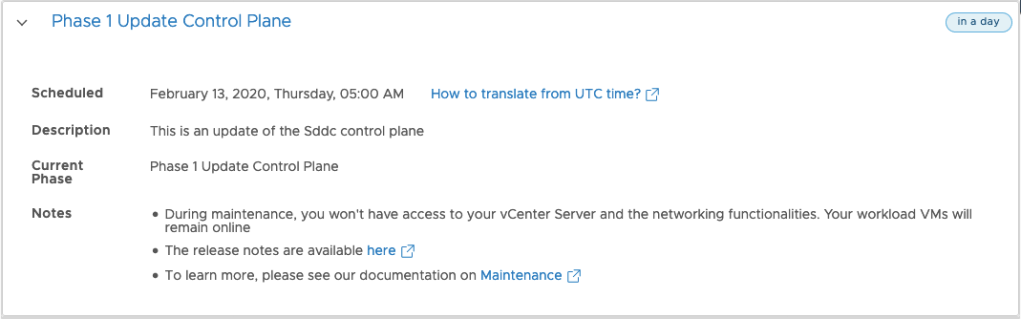 Finally, the separate phases are broken out to inform you of the expected window for upgrades / maintenance to the Control Plane, Hosts, and NSX.