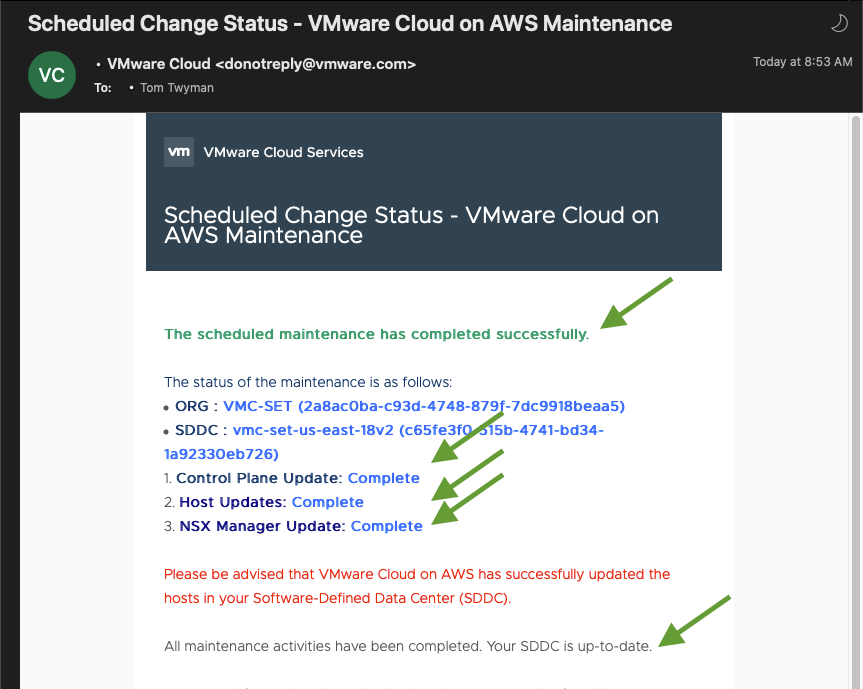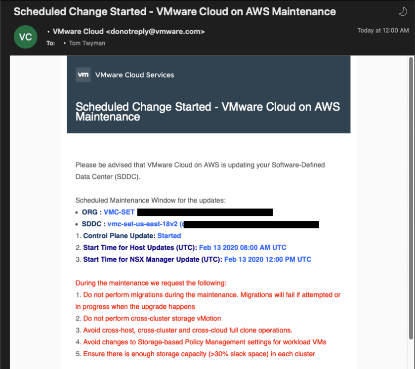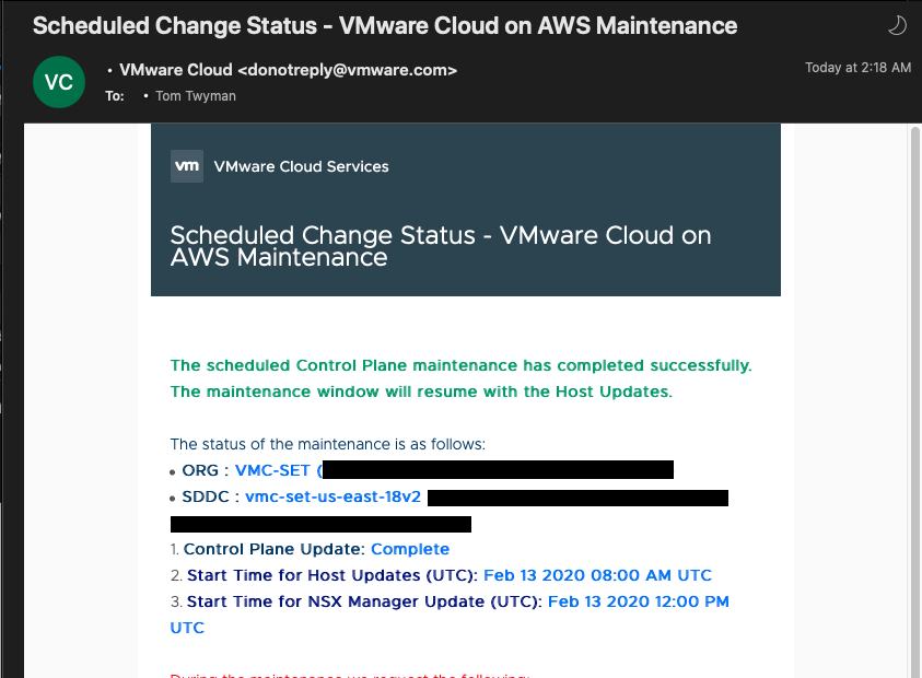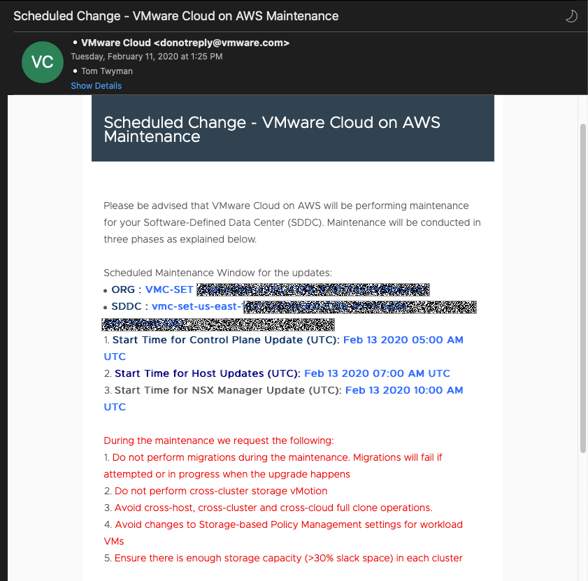Naturally, you will receive notifications within the cloud portal as well. Once an upgrade is scheduled, you will see a banner warning in your Cloud Console for VMware Cloud on AWS.