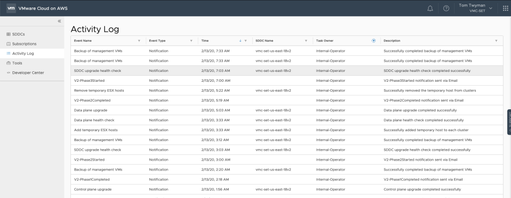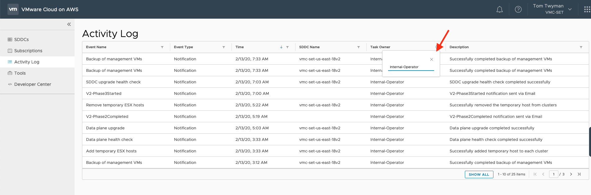 Finally, everything is captured, step by step, in the Activity Log for your SDDC. Use the filter capabilities to filter for tasks completed by “Internal-Operator” as indicated in the screen shot below.