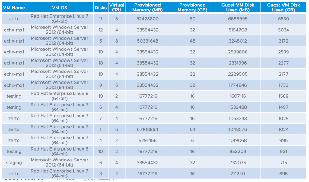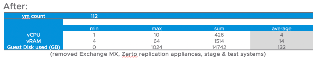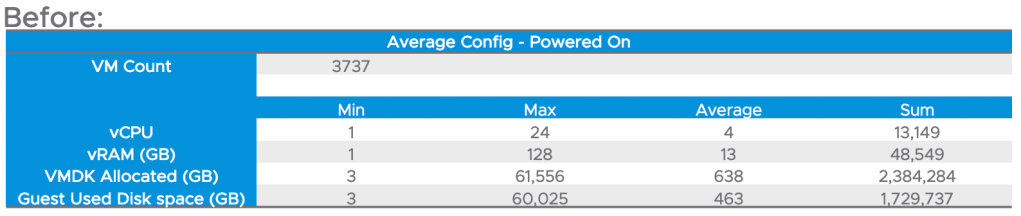 Similar to the example above, I went through their environment, removed virtual machines that were powered off, and identified the top consumers of storage. I reviewed this list with the customer, and we agreed to ultimately pull about 400 virtual machines out of the inventory – just about 10% of the environment were identified as non-candidates for migration. The summary of the remaining virtual machines is below.