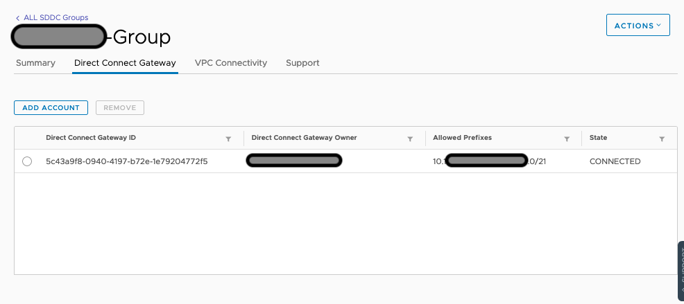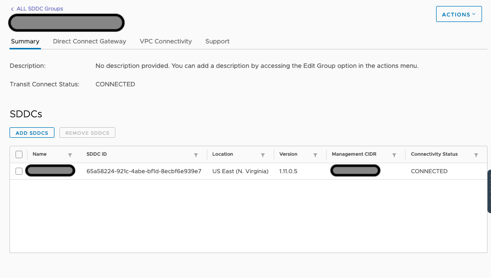 Then, following the documented procedure to create a Transit Connect (found in the official M.11 docs here), we created a SDDC Group and worked with the customer’s AWS team to accept the request to attach to their DX GW.