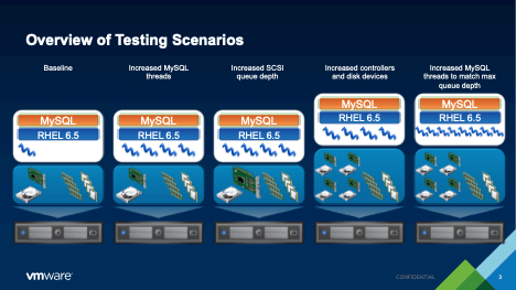 The entire application was already virtualized, running on vSphere 5.0, on 5 year old servers, and a 7 year old EMC VMAX fibre-channel array. Furthermore, each MySQL server was built with only a single VMDK, and a single virtual SCSI adapter, making the synchronized write an extremely expensive operation in terms of performance because such a flush-write-acknowledge-release pattern is a single-threaded, blocking behavior – meaning no other storage operations can complete until that transaction is finished, unless there are additional storage devices to engage – which in this case there were not. Despite the age of the infrastructure – and the chosen deployment architecture – the application ran extraordinarily well.