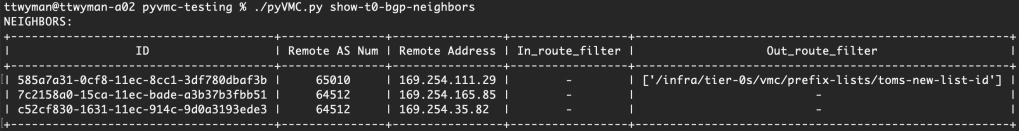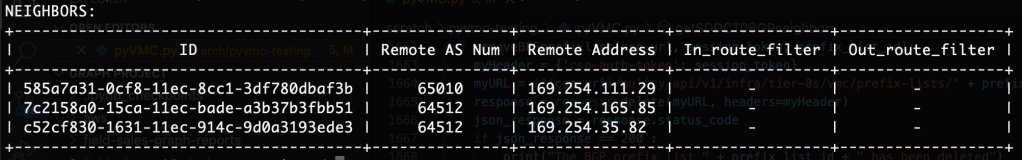 Using pyVMC to retrieve the BGP neighbors for the SDDC shows the following: