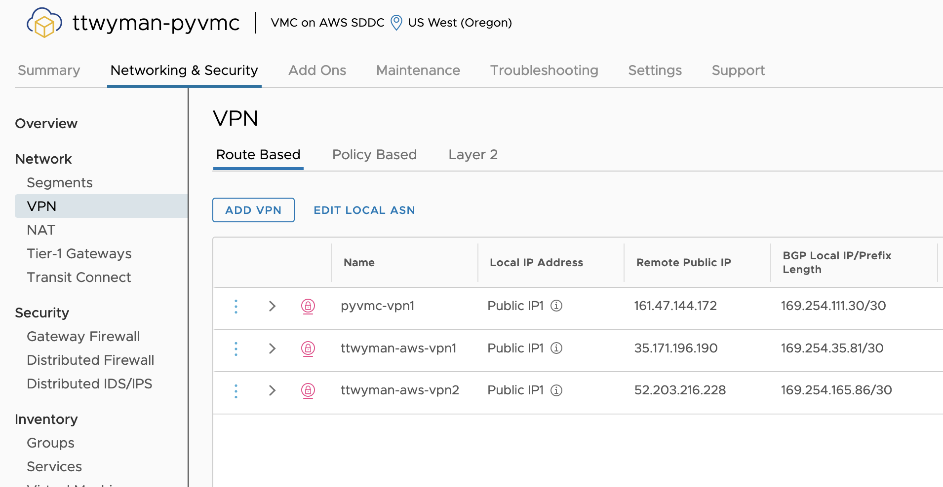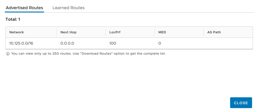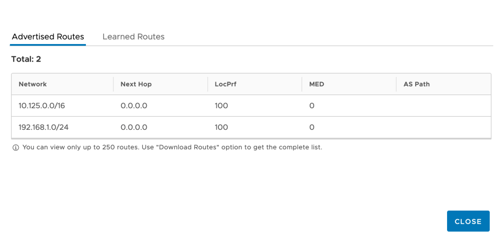 And sure enough, if we review the route advertisements in our SDDC for the VPN in question, we see that 192.168.x.x networks are no longer being advertised.