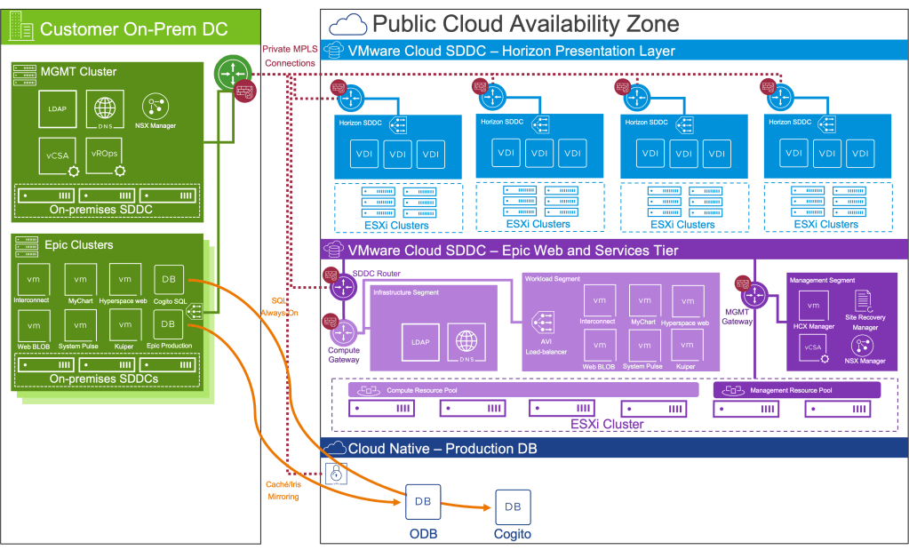 The reference architecture diagram below is just a taste – we continue to flesh out reasonable, supportable design patterns with our cloud partners. The benefit to our customers, of course, is by and large they are already running much of their EMR system on VMware on premise – and therefore it is relatively straightforward to establish a supported deployment design on VMware Cloud.