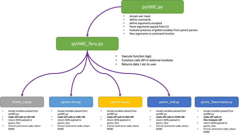 Additionally, we spent a TON of time restructuring the project into multiple modules, and refactoring all the functions to leverage a mature python module for argument handling – argparse. Leveraging argparse gives us the flexibility to handle user input in a much more elegant way than just using sys.argv, plus it is self-documenting, making it much easier to troubleshoot, extend, and change functions in the future. Finally, pretty much all the logic for how to manipulate data, return data to the user, error handling, etc has been moved to a ‘functions’ module, which allows us to keep all the code directly related to API functionality separate. The new project structure is laid out somewhat as follows: