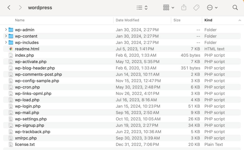 Believe it or not, if you have a functioning WordPress installation, you should in many cases be able to simply replace the contents of the main WordPress directory with the contents from the site you are trying to migrate. Since these files are simply resident on my MacOS file system, it was a simple matter to just make a copy of them.