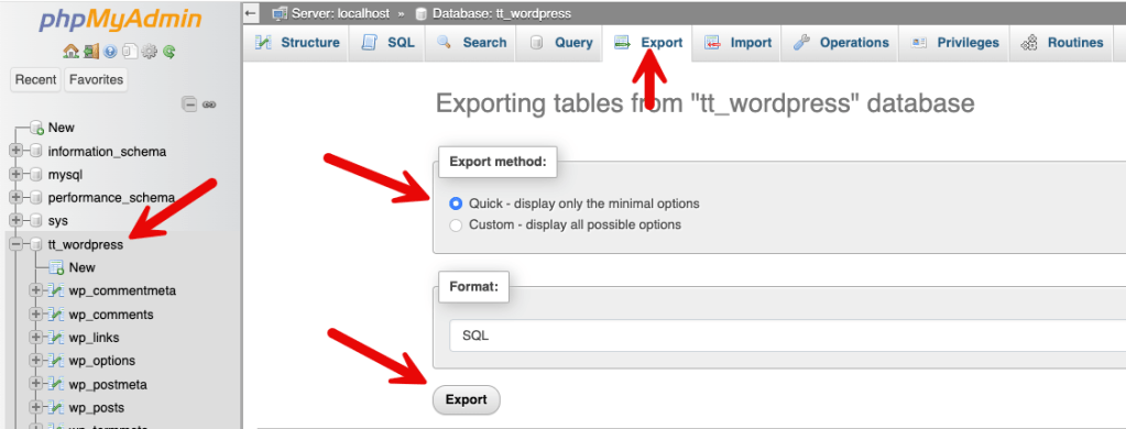 Backing up your WordPress database is straightforward. I used PHPMyAdmin to export / dump my WordPress database in about 15 seconds. If you haven’t done this before, WordPress has thorough instructions here: https://developer.wordpress.org/advanced-administration/security/backup/database/