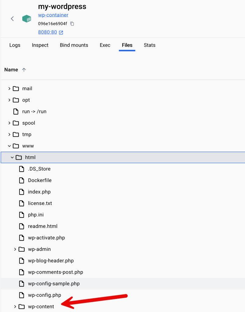 Then I just used Docker Desktop to grab a copy of the “wp-content” folder from the WordPress container: