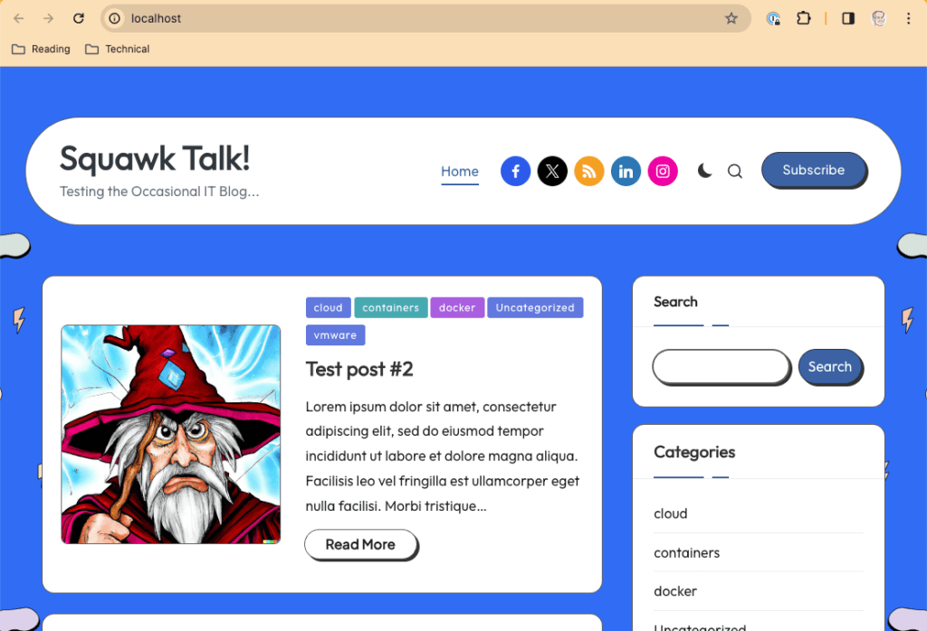 To be sure that my sample data actually populates a new, ‘test’ blog, I simply repeated the steps from How do I ‘containerize’ something, part 4: Docker and MySQL and How do I ‘containerize’ something, part 5: Docker and WordPress with the test / sample data, and sure enough, test blog!